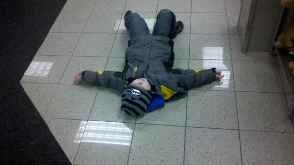 The type of shopping that automatically turns me into an asshole is when I’m forced into a store that I would never go to on my own. For instance, we walked into Michael’s arts & crafts store yesterday, and Julie tells me we need to get a glue gun, cork board, marbles, a clock kit and sandpaper (fucking Pinterest is suddenly the bane of my existence). Since I’m totally confused by these items and can’t understand how they’re possibly going to affect me in a positive way, I go into one of two modes: Either I turn into the little kid in the picture above and find a place to lay down, or I go into dickheaded sarcasm mode. My brain used an embedded “women be shopping” formula and concluded I was in for a 90 minute nightmare. I decided to take the dickheaded sarcasm route this time.