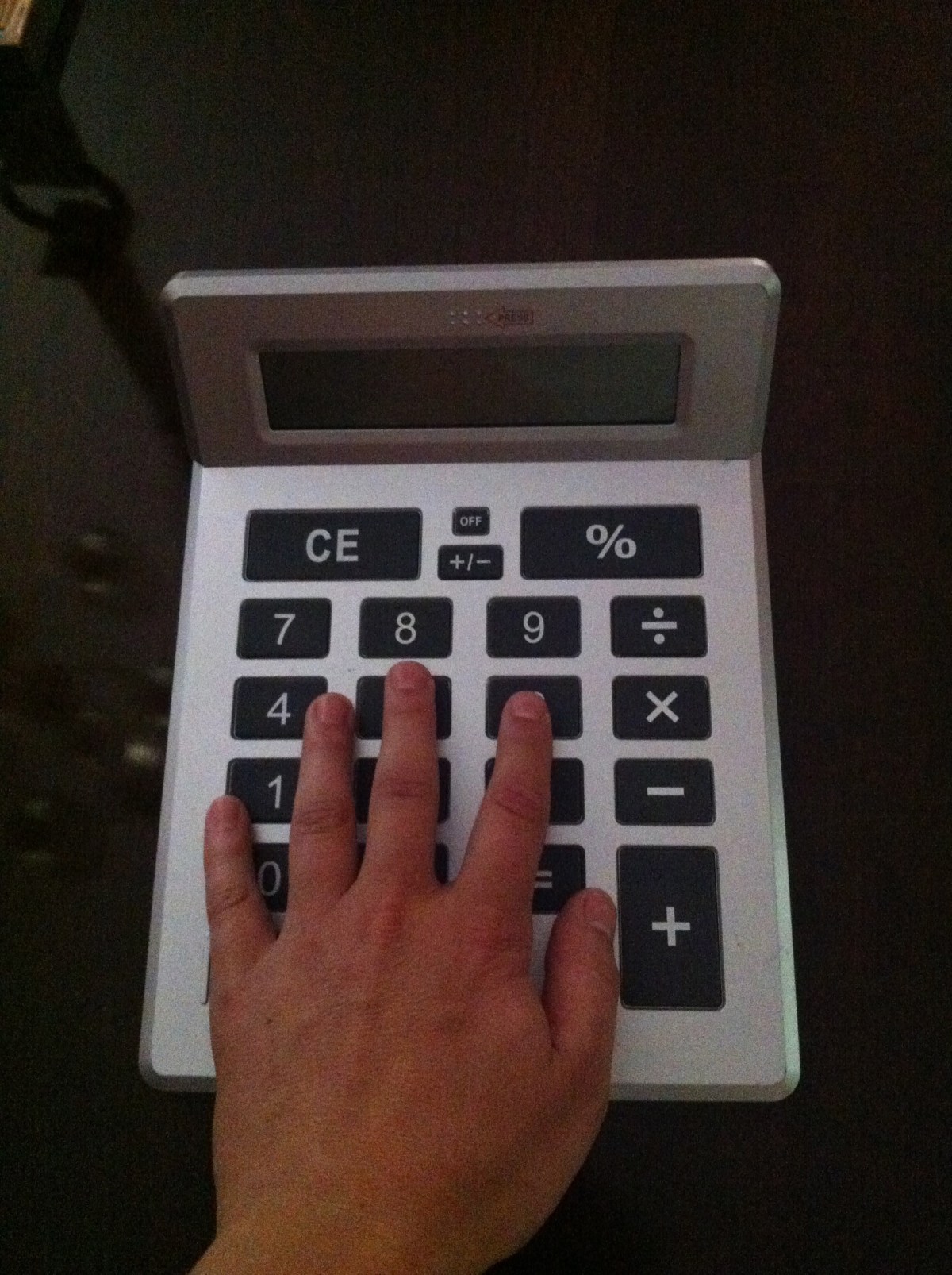 It’s roughly the size of the first computer ever invented, it’s heavier than my 17-inch laptop, and I’m pretty sure a blind person could see those numbers. What causes someone to need a calculator that requires him to use an entire fist to punch in each number?