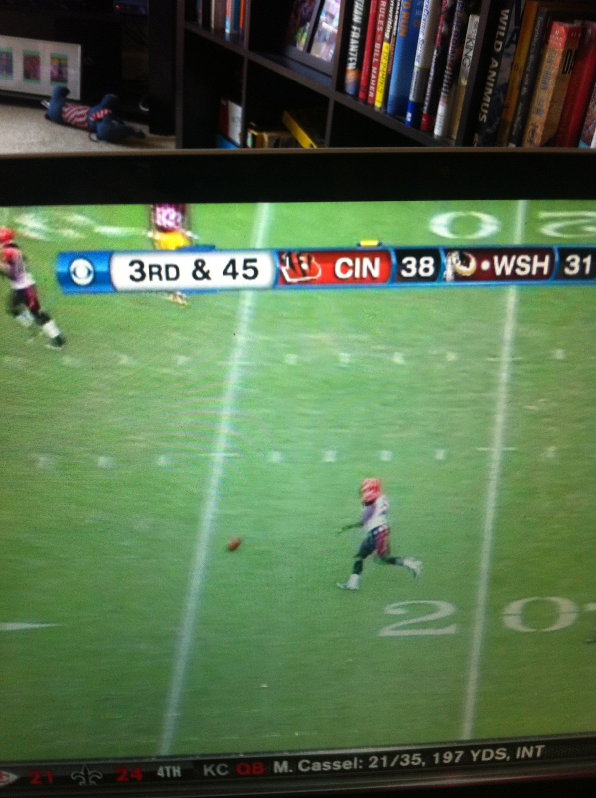 -Jim Nantz had the line of the day if you’re the type of person who roots for Houston to fail: “And TJ Yates is warming up on the sidelines.” A Matt Schaub injury seems to be the only thing that could derail Houston’s bid to grab a top-two seed in the AFC playoffs this year.